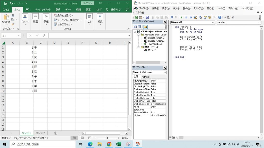 VBAの renshu1 の内部にカーソルをあてて、左クリックした状態で